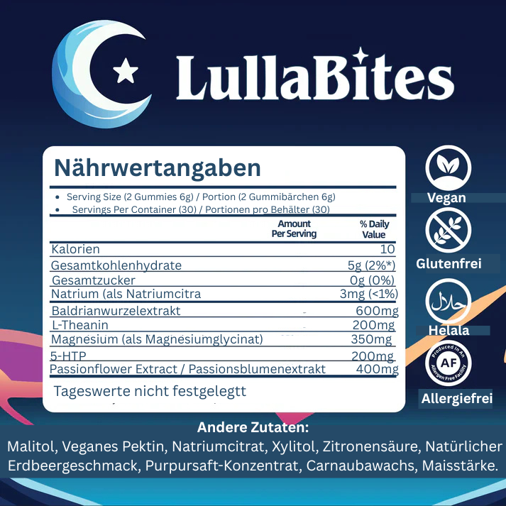 LullaBites unterstützt Entspannung, fördert tieferen Schlaf und sorgt dafür, dass du erholt in den nächsten Tag startest.